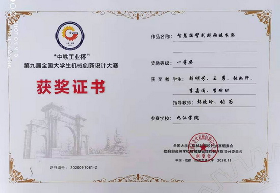 11月20-22日,第九届全国大学生机械创新设计大赛决赛在西南交通大学举行,本届大赛的主题是“智慧家居、幸福家庭”,共有来自678所高校、4719件作品参赛。我校机械与智能制造学院学子获得全国一等奖1项、二等奖2项,为九江学院参加此项赛事以来取得的最好成绩。
