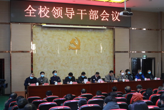 1月13日下午,学校在香远楼报告厅召开全校领导干部会议,对学期末和寒假工作进行部署安排。校党委书记赵伟,校长刘晓东,副校长纪岗昌、王万山、陈春生、杨耀防、夏启国、查振华,纪委书记李广欣,副校长陈小林,党委委员王殿元、冯健、刘遵海出席会议。会议由校党委副书记魏立平主持。全校各部门和二级学院党政负责人参加会议。