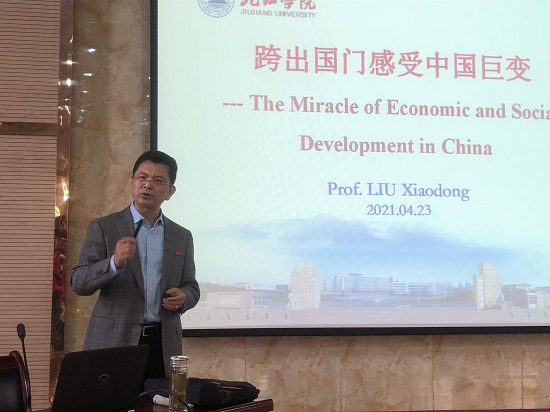 4月23日世界读书日,在学校党史学习教育深入开展之际,校长刘晓东教授应邀在香远楼三楼报告厅为外国语学院师生作了一场题为《跨出国门感受中国巨变——The Miracle of Economic and Social Development in China》的精彩讲座。外国语学院党政班子成员及300余名师生代表聆听了刘校长的讲座。