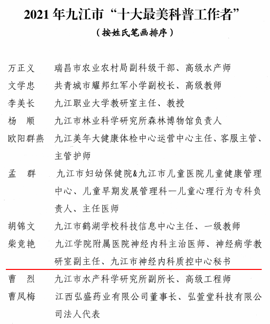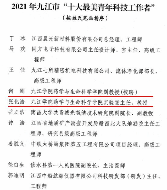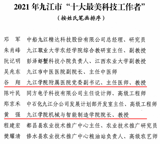 近日,中共九江市委人才工作领导小组办公室、九江市科学技术局、共青团九江市委、九江市科学技术协会联合下发了《关于选树2021年九江市“十大最美科技工作者”、“十大最美青年科技工作者”、“十大最美科普工作者”的决定》。我校教师谷翔、黄强、何刚、张化浩、柴竞艳获得九江市三个最美系列荣誉称号,其中黄强、谷翔荣评2021年九江市“十大最美科技工作者”,何刚、张化浩获评2021年九江市“十大最美青年科技工作者”,柴竞艳获评2021年九江市“十大最美科普工作者”。