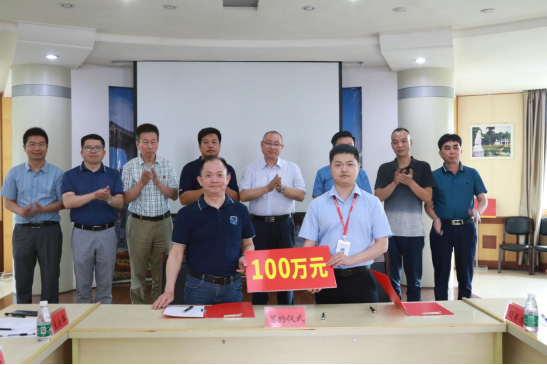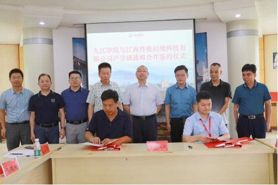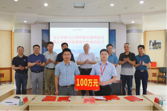 会上,我校与江西终极幻境科技有限公司签订了产学研战略合作协议,江西终极幻境科技有限公司出资100万元委托我校进行创新创业人才协同培养,出资100万元进行九江学院终极幻境产业研究院建设。
