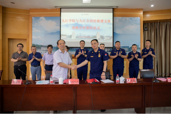 随后,纪岗昌与九江市消防救援支队政委进行了签约并合影留念。九江市消防救援支队科室与我校相关职能部门、二级学院进行了对接交流,双方将在思政教育、消防队伍人才的培训、学历提升、新装备研发、培养水域救生人员等多方面展开合作。