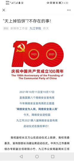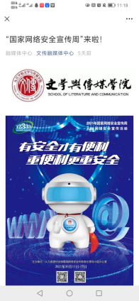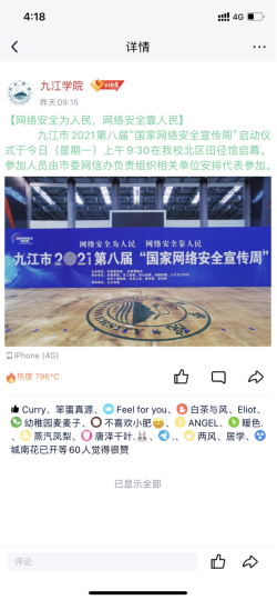 为营造网络安全文化氛围,线上九江学院官方微信公众号、官方微博QQ账号在网络安全宣传周期间开展网络安全进校园的宣传活动,组织江西省网络安全知识竞赛、发布防网络诈骗、注意个人网络信息安全等知识,得到广大同学的关注和积极参与;外国语学院学生会微信公众号及微博发布“加强网络安全,防范电信诈骗”推文,全院师生积极转发宣传,并参与江西省网络安全知识竞赛活动;文传学院发布推文宣传“国家网络安全宣传周”;附属医院通过公众号宣网络安全宣传周倡议书、宣教知识等。