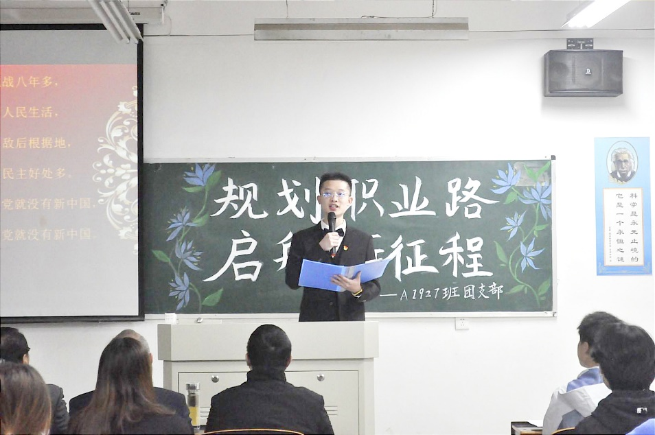 活动在全体师生合唱“没有共产党就没有新中国”的嘹亮歌声中拉开了序幕。A1927班学习委员黄浩楠同学介绍了团日活动的主题、目的与意义,全体师生共同观看了会计职业前景等相关视频。