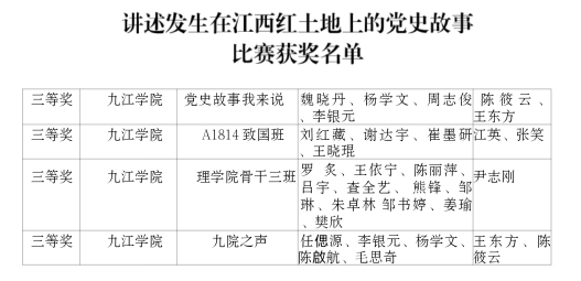 我校各二级学院积极开展“唱响红色经典,凝聚奋进力量”“红色走读”活动,教育引导广大青年学生坚定理想信念,自觉争当红色基因的传承者、实践者。近日,省委教育工委、省教育厅组织开展的全省高校“红色走读”活动获奖名单公布,我校多个团队取得优异成绩,荣获“实地走读成果”一等奖1个、二等奖1个、三等奖3个;荣获“讲述发生在江西红土地上的党史故事比赛”三等奖4个。各二级学院开展“三下乡”暑期学生社会实践活动,其中,外国语学院青年大学生赴东山村“三下乡”实践服务队被评为九江市大中专学生志愿者暑期文化科技卫生“三下乡”社会实践活动优秀服务队,文学与传媒学院三下乡服务队喜获2021年度九江市大中专学生志愿者暑期文化科技卫生“三下乡”社会实践活动优秀服务队、2021年度九江学院暑期文化科技卫生“三下乡”社会实践活动优秀服务队荣誉称号。