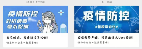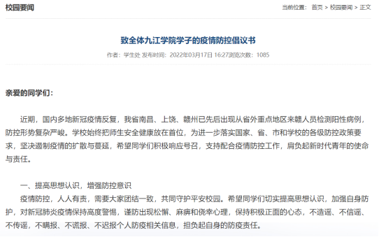 为做好防疫宣传工作,普及防疫科学知识,提升防控意识,让学院师生们以更加积极的心态应对疫情,校疫情防控领导小组办公室、学生处、校工会等部门分别发布了《关于疫情防控期间主校区校门实施临时管制的通知》、《致全体九江学院学子的疫情防控倡议书》、《关于暂停开放教职工活动中心的通知》等。