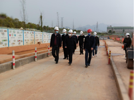 在施工现场,赵伟向蒋文定介绍了综合体育馆项目设计、施工进展等项目建设情况。