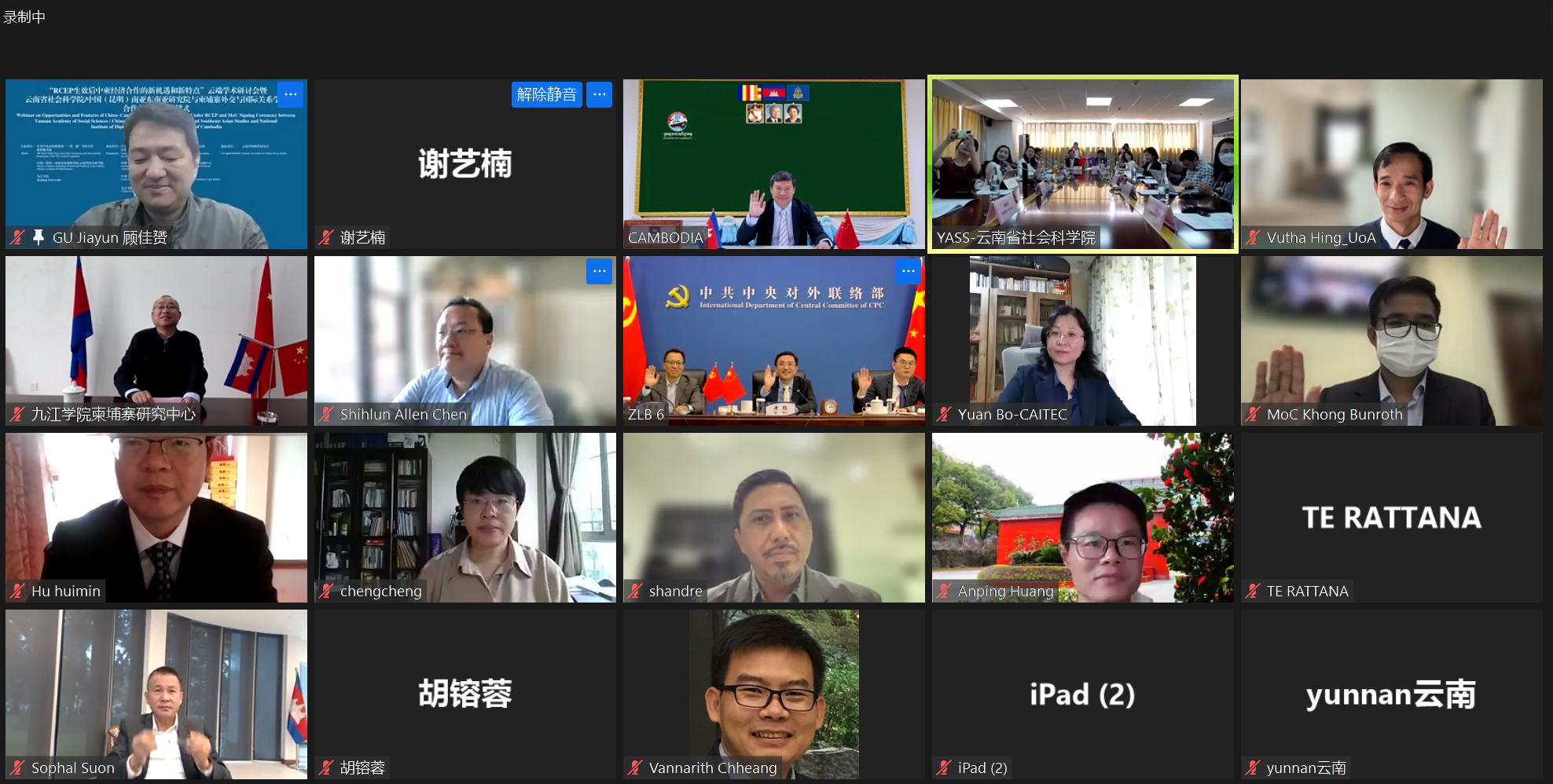 4月29日下午,中联部“一带一路”智库合作联盟秘书处、中国(昆明)南亚东南亚研究院/云南省社会科学院与九江学院联合主办的“RCEP生效后中柬经济合作的新机遇和新特点”云端学术研讨会举行,来自柬埔寨以及中国北京、广东、广西、江西、云南等地的政府部门、智库机构、高等院校的200多名专家学者以视频连线的方式相聚云端,共同研讨在RCEP生效后中柬经济合作的相关议题。
