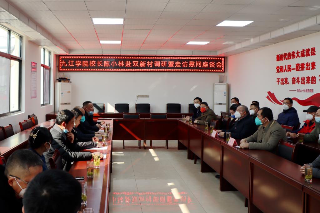 在随后召开的调研慰问座谈会上,陈小林作了讲话。他指出,过去一年,九江学院以党建引领助推乡村振兴,充分发挥党员在乡村振兴中的带头作用,乡村振兴工作取得显著成效,双新村的村风、村貌发生明显变化,文明乡村、健康乡村建设效果良好。他强调,要全面贯彻落实党的二十大精神,谋划推进双新村的工作,让党的二十大精神在乡村落地见效;要抓住产业振兴的龙头,结合双新村独特的地理环境,开发特色农产品,做好产品的品牌和标准化建设及市场推广,壮大村有经济,增加老百姓收入;要以老百姓的获得感、幸福感和安全感作为检验工作的出发点,让驻村帮扶工作见成效;要重视百姓的健康和就医问题,普及健康知识和疾病预防能力,让健康中国落实到乡村。