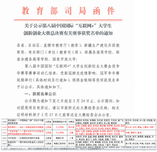 日前,教育部公布了第八届中国国际“互联网+”大学生创新创业大赛全国总决赛有关赛事获奖名单。在本次大赛中,我校师生在去年首获国家级奖的基础上又获突破,再创新高,位居江西省应用型本科高校第一,其中机械与智能制造学院《新科智炸——油水一体智能油炸机领跑者》和电子信息工程学院《“听音号脉”——基于光纤干涉仪的极低频声波高精度无源感知技术》2个项目获得国赛铜奖。