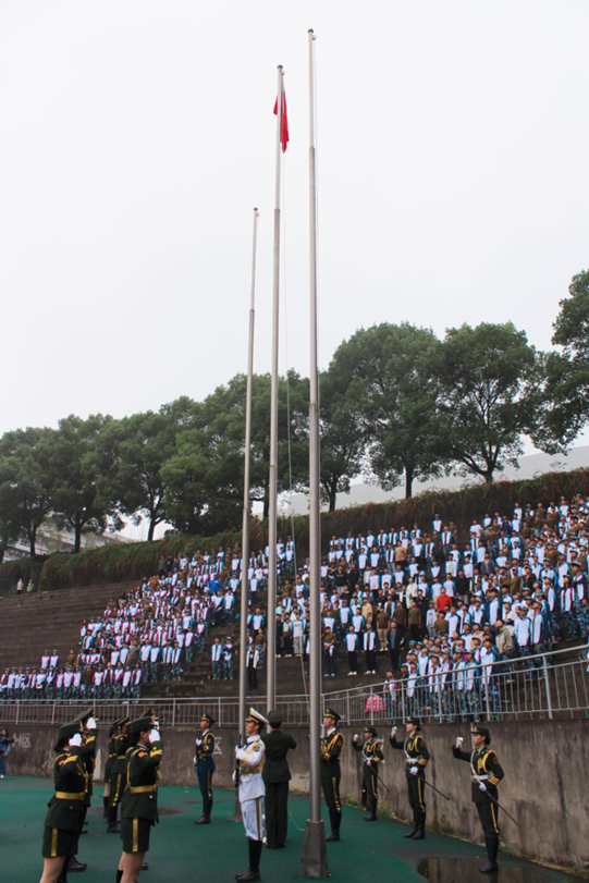 上午8:30,在国歌慷慨激昂的旋律中,鲜艳的五星红旗冉冉升起,拉开了军训总结表彰大会的帷幕。