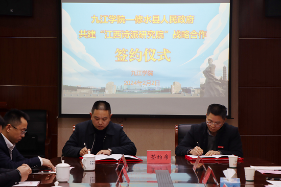 2月2日,九江学院与修水县人民政府共建“江西诗派研究院”战略合作协议签约仪式在九江学院成功举行。九江学院党委副书记、校长陈小林和修水县委副书记、县长刘婕出席会议并致辞。九江学院党委委员、副校长李松志主持仪式并代表九江学院签约。