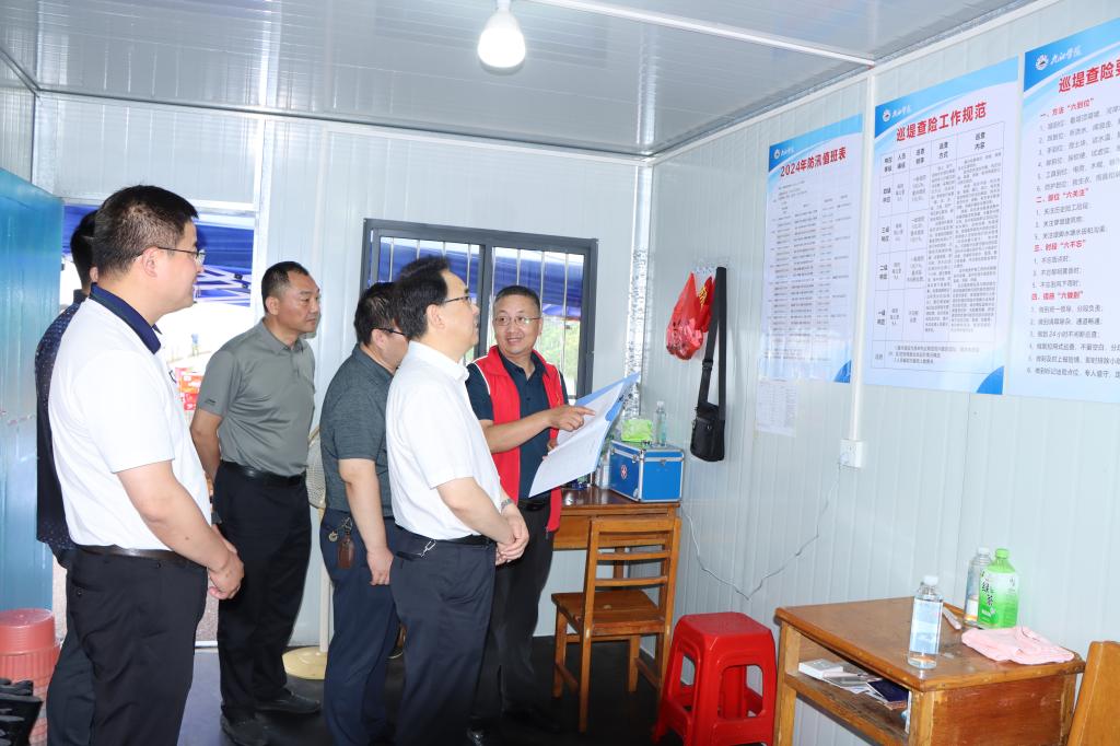 李明斌详细了解巡堤人员安排、防护物资配备以及巡堤查险工作情况,并与正在巡堤的值守人员深入交流,仔细询问巡堤查险标准,分析讨论渍水、裂缝、管涌等可能存在的险情。