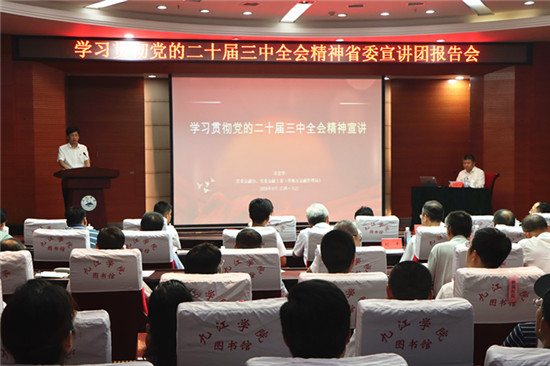 按照省委统一安排,8月19日,学习贯彻党的二十届三中全会精神省委宣讲团报告会在我校逸夫图书馆报告厅举行。省委宣讲团成员、省委金融办分管日常工作的副主任、省委金融工委主持日常工作的副书记、省地方金融管理局局长许忠华作宣讲报告。校领导、全校副处级以上干部、民主党派负责人、思想政治理论课教师、学生代表等180余人在主会场参加了报告会,全校各单位师生1000余人通过在线直播参会。报告会由校党委委员、副校长查振华主持。