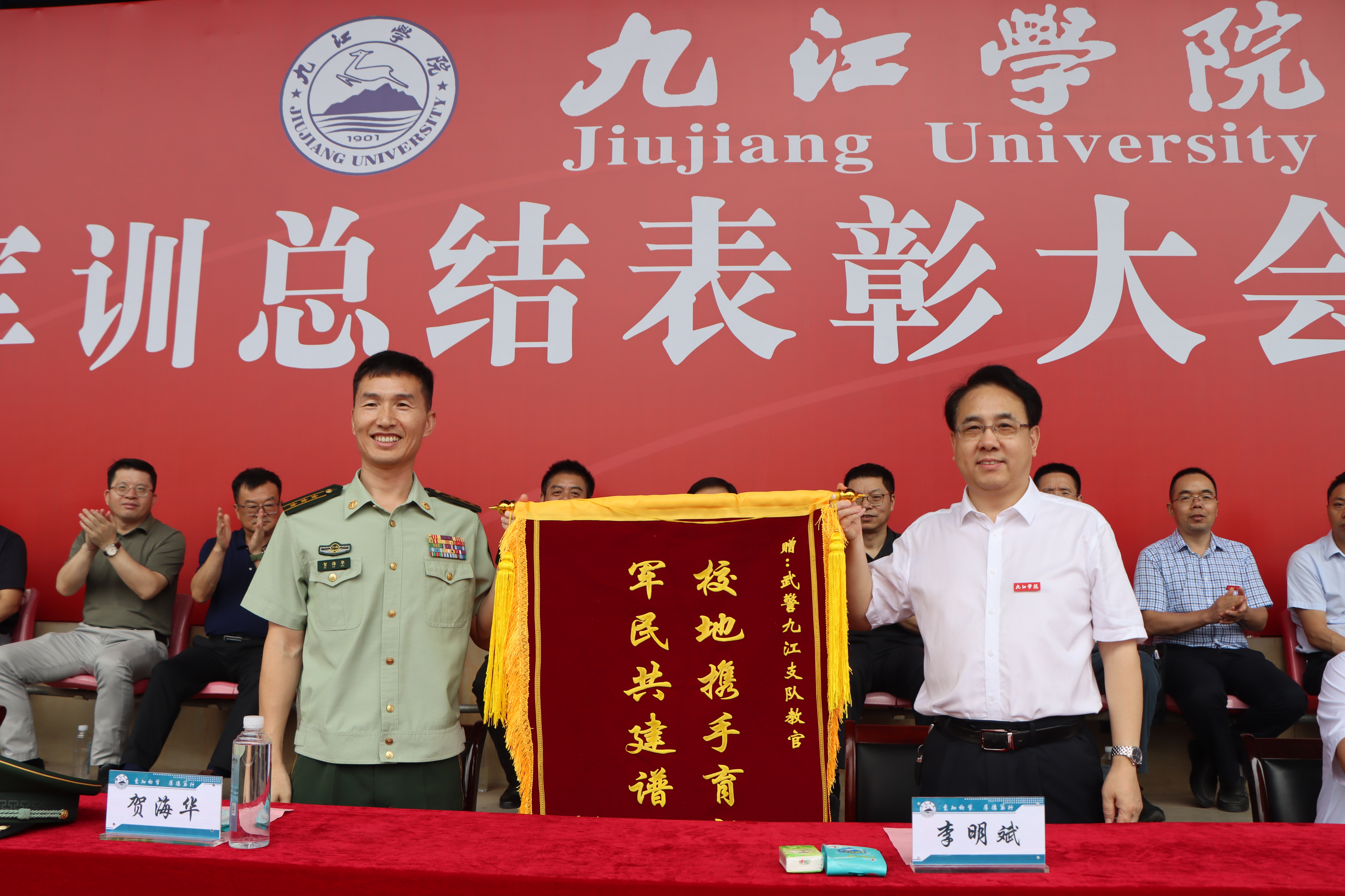 党委书记李明斌代表学校向武警九江支队赠送了锦旗。