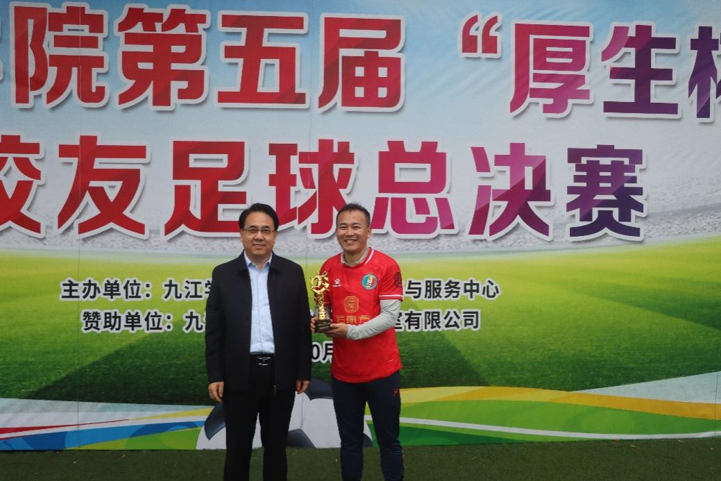 金秋十月,天高云淡。10月26日下午,九江学院第五届“厚生杯”校友足球、篮球总决赛在九江学院北区足球场和濂溪区篮球公园顺利举行。校党委书记李明斌,校党委委员、副校长、校友会会长查振华到场观看比赛。李明斌为校友足球、篮球总决赛冠军球队,“最有价值球员”以及“MVP”颁发奖杯与锦旗,查振华为校友足球、篮球总决赛亚军球队颁发奖杯与锦旗,并依次为两场比赛开球。
