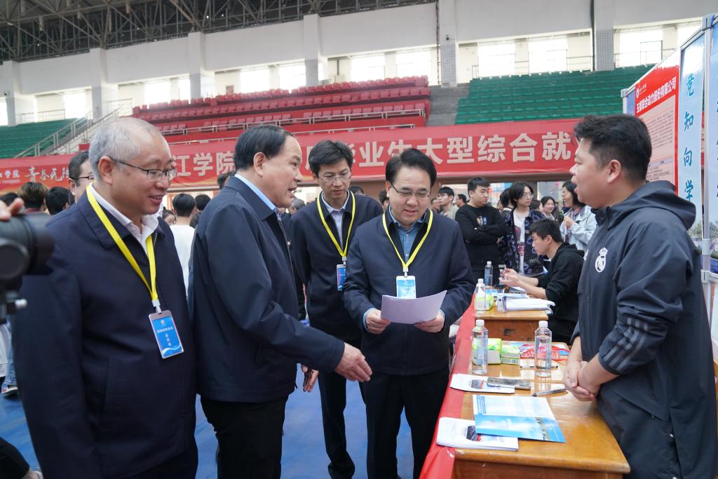在招聘会现场,李明斌、陈小林走访了各个展台,与用人单位负责人亲切交流,详细了解招聘动态及岗位需求,听取对学校人才培养、实习实践、校企合作、产教融合和就业服务等方面的建议。