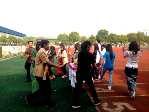 4月16日是柬埔寨新年的最后一天,我校来自柬埔寨的孔子学院奖学金生在北区田径场举行了庆祝活动,国际交流学院全体老师和来自各国的留学生以及中国学生共同庆祝柬新年。