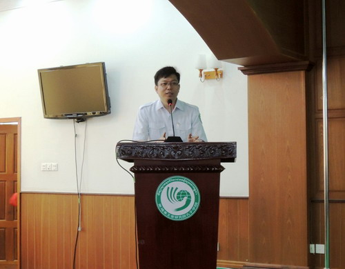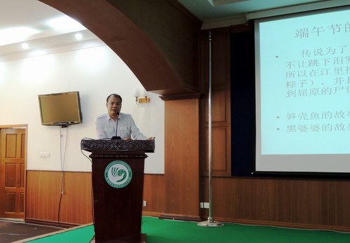 帅式毅做了《中国传统节日介绍——端午节》的讲座。他首先介绍了端午节的由来、风习及庆祝活动,同时用比较的方式联系了柬埔寨的节庆活动。他说,中方承办院校九江学院就是屈原故事中楚国的最东边,曾举办过国际龙舟赛;中柬两国文化交流源远流长,两国风习有很多相同的地方。希望学员们通过参加中国文化活动来加强汉语学习,也希望学员们在将来能用中文把柬埔寨的传统节日柬新年、亡人节、送水节等介绍给中国朋友。