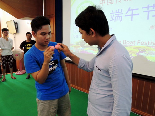 谢莫尼勒指出,端午节在柬埔寨也很受大家喜欢,希望学生们通过此次活动可以进一步了解端午节,了解端午节文化,了解中柬两国相通的习俗。通过播放孔子学院的武术文化活动宣传短片,他希望孔子学院的学生多多参与到孔子学院每周五的“每周中国文化活动”当中,体验了解中国的各种传统文化习俗。