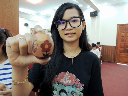 学生展示画好的鸡蛋