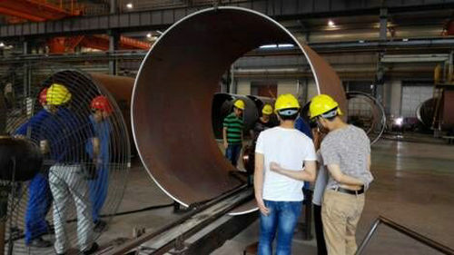 江西制氧机有限公司是一家主要生产压力容器的企业。压力容器一般由筒体、封头、法兰、接管、密封元件和支座等零件和部件组成,此外,还配有安全装置、表计及完成不同生产工艺作用的内件。压力容器主要加工工艺流程:选材→下料→加强圈焊接→筒体、封头环缝焊接→法兰、接管装配焊接→接管与筒体装配焊接→焊缝无损检测→热处理→耐压试验和泄漏试验→表面处理(喷砂、喷漆)→成品。在企业实习期间,学生对压力容器的设计、焊接工艺评定以及生产工艺流程有了初步了解。师傅们娴熟的操作以及高工们渊博的知识,严谨、认真的工作作风也给同学们留下了很深刻的印象。