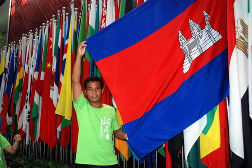 王虎在孔子学院总部和柬埔寨国旗的合影