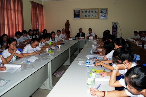 9月12日,柬埔寨王家研究院院长、孔子学院理事长克罗媞达阁下(H.E.KHLOT THYDA),王家研究院秘书长李树提龙阁下(H.E. LY SOTHYRATH),柬埔寨王家研究院孔子学院院长谢莫尼勒阁下(H.E.CHEA MUNYRITH)、中方院长帅式毅先生,国家汉办志愿者管理老师赵玉玺先生与王家研究院孔子学院新教师及志愿者亲切见面,并进行了座谈。座谈会由帅式毅主持。