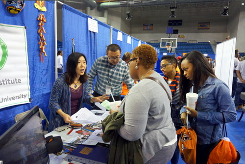 萨凡纳州立大学每年会在春、秋两季举办“校园开放日”活动,邀请全美的高中生和家长们来参观大学校园,并通过展台的方式让来参观的学生和家长与各个院系和服务部门的老师沟通交流。我校与萨凡纳州立大学合办的孔子学院是萨凡纳州立大学重要的国际交流项目,在此次校园开放日活动中,孔子学院的展台吸引了大批的美国高中生和家长来咨询。孔子学院的几位老师通过图片、视频、PPT等多种方式详细介绍了萨凡纳州立大学孔子学院和九江学院的情况,同时展示了萨凡纳州立大学孔子学院举办过的社区文化活动、汉语教学课程设置、教材、HSK考试和奖学金等项目。