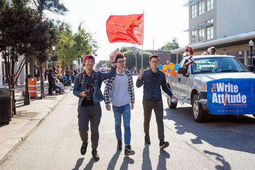美国当地时间10月17日上午,萨凡纳州立大学孔子学院全体教师和部分我校在萨凡纳州立大学的交换生参加了萨凡纳州立大学建校125周年庆典游行活动。此次游行活动持续近2个小时,行程3.5英里。参与活动的人员有1000多人,车辆近200辆。