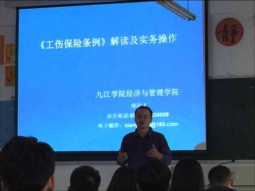 近日,由经管学院第六党支部和人力资源教研室联合举办的学术沙龙活动——“《工伤保险条例》解读及实务操作”学术讲座在义丰楼502教室举行。此次活动承接上学期系列讲座,是本学期人力教研室举办的首场学术沙龙活动。讲座由经管学院副院长项益才博士主讲。经管学院人力资源管理专业2012、2013及2014级学生和人力资源管理教研室在校教师参加了此次活动。经管学院第六党支部书记肖克奇教授主持了讲座。
