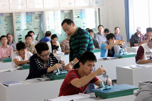 课堂上,赵小军老师先简要介绍了本节课实验项目——齿圈径向跳动的测量与检验的实验目的、实验设备及实验方法,重点讲解了有关实验原理和基本要求。赵老师边讲解边演示,对齿轮测微仪、百分表的组装、测量,数据记录、计算,结果判断等每个实验步骤逐一操作、演示,并提示实验中可能存在的失误和问题。在具体指导学生实际操作中,注意观察学生实际操作情况,耐心进行指导,总体实验教学效果良好。