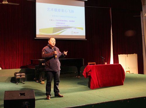 12月3日晚,艺术学院诚邀优秀校友,童心飞扬教育集团创办人、总裁李友建于香远楼一楼报告厅为师生们作了一场精彩的讲座。学院党委书记王春生、党委副书记沈杨、团委书记刘元明及辅导员老师与音乐学专业学生和全院学生干部近500人共同参加和聆听了此次讲座。讲座由沈杨副书记主持。