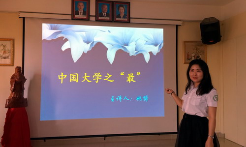 首先,姚博老师重点向学生们介绍了一系列中国大学之“最”,即最好的大学——北京大学、清华大学,办学最早的大学——天津大学,最美的大学——武汉大学、厦门大学,学生最多的大学——吉林大学,留学生最多的大学——北京语言大学,与柬埔寨有合作的大学——九江学院、同济大学、哈尔滨师范大学等,以及就业最好的大学排行榜等等。在介绍过程中,姚博老师主要向学生展现了各个大学的四季不同的校园风光,学校硬件设施、著名校友以及学校的办学特色。
