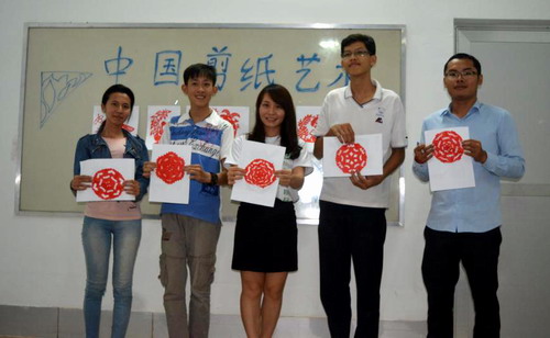 活动最后,学生们纷纷与自己的剪纸作品合影留念,还一起将他们的剪纸作品贴在教室内作装扮,整个教室瞬间充满了一股浓浓的中国风。