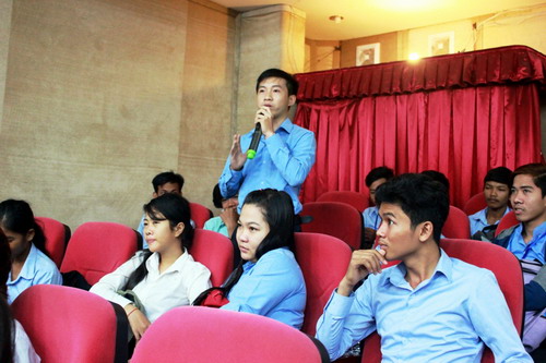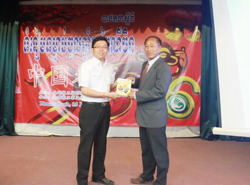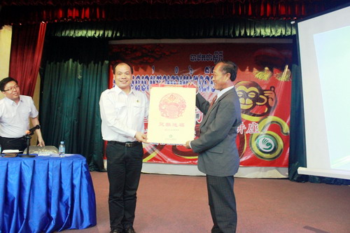 谢莫尼勒阁下向在座的大学生介绍了柬埔寨王家研究孔子学院的工作性质,这是一所传播中国语言和文化的教学机构,也是一所科研机构,更是搭建中柬友谊之桥梁。他还给同学们推荐了几本由孔子学院编著的,介绍中国民俗、在柬华人中华民俗活动的书籍,如《中国灯笼》、《千年友好—中柬交流史话》、《孔子—无冕之王》、《扶南时期的高棉哲学》。最后,勒院长提出了两点希望:一是王家文化与艺术大学派专家来孔院讲授柬埔寨文化;二是在王家文化与艺术大学开设中国文化课程。