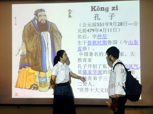 陈老师从大家熟悉的中国著名思想家、教育家——孔子说起,拉开文化讲座的序幕,她引用《论语》“三人行,必有我师焉”、“学而不思则罔、思而不学则殆”等名言深入浅出的阐述儒家智慧,在讲解过程中从古代办学引至中国现代教育。