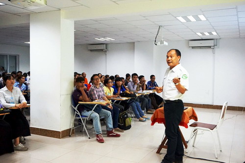 帅式毅院长简要介绍了孔子学院中方承办院校九江学院的情况,九江学院处在中国华东地区连接中西部的枢纽城市九江,历来是兵家必争、人杰地灵之地。他指出,2013年,九江学院和亚欧大学签署了合作协议,每年会为亚欧大学提供10个奖学金名额,2015年,首批7名学生赴九江学院学习,目前该批学生在九江学院学习顺利。九江学院还将为亚欧大学学生提供江西省政府奖学金、九江学院奖学金,学生通过HSK5级以后,可以选择插班和中国学生同堂进行专业学习。作为九江学院现任的国际合作交流处处长,他表示欢迎亚欧大学学生申请奖学金或自费到九江学院学习。孔子学院为中柬友好交流搭建了一座座桥梁,2015年5月,中国江西省政府在《参与丝绸之路经济带和21世纪海上丝绸之路建设工作要点》中,把“继续加强九江学院合作建设柬埔寨王家研究院孔子学院”作为优先推进项目。随着“一带一路”项目建设的全面铺开,为柬埔寨学生就业、赴中国留学带来了新机遇; “一带一路”建设过程中将需要大量的懂中文、有专业的本土人才。