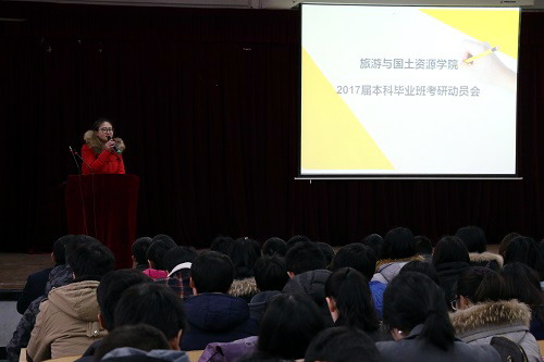 为推动学院2017届本科毕业班的考研工作,培养学生刻苦学习、勇于攀登的考研氛围,激发学生考研积极性。3月11日下午,旅游与国土资源学院在文理楼报告厅召开2017届本科毕业班考研动员大会。院长李松志、副院长孙冬英、张辉,教务科、学生科、相关班主任以及2017届全体本科班同学参加了本次动员会。动员会由孙冬英副院长主持。