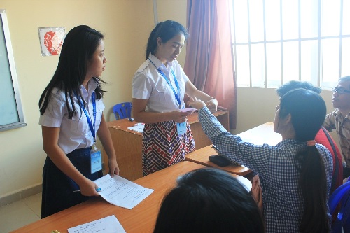 3月20日上午,2016年上半年HSKK(汉语水平考试口试)在柬埔寨王家研究院孔子学院电子语音室举行,本次参与考试的考生人数多达77人。孔子学院本部全体教师志愿者共同参与其中,为柬埔寨的考生们提供各种必要的服务,助其顺利地完成考试。