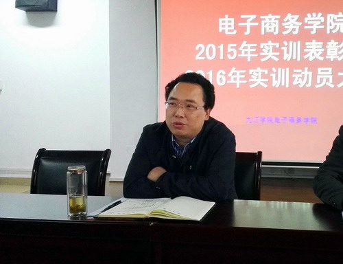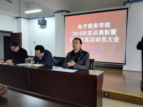 为了总结经验,树立典型,促进和推动电商学院实训工作规范有序地开展, 3月30日,电子商务学院在厚德楼303会议室举行了电子商务学院2015年实训表彰大会暨2016年实训动员大会。院长郑祚双、书记丁文林、副院长郑孝庭出席大会,2015年全体实训学生和2016年第2期实训学生参加了会议,会议由实验室主任陈显章主持。