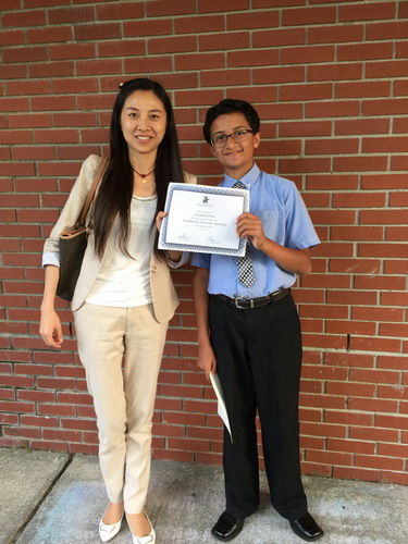 在表彰大会上,中学部负责人Jesse Lazzuri宣读了获奖学生名单,各科教师给获奖学生颁发证书和奖章,共颁发了各年级各学科奖,优秀学生奖及总统学者奖等二十多个奖项。获得中文学科奖的学生是八年级的印度学生Aryaman Arora.