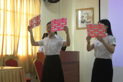 首先,许老师用剪纸剪出的不同颜色的“喜喜”字吸引了学生目光,并询问学生该字的意义和应用的场合。学生们准确地回答出了教师的提问,并解释说喜字现在在柬埔寨的婚礼中也在使用。随后,许老师用了不同的中国结婚服饰图片展示给学生,让学生了解中式婚礼。因为参加文化讲座的学生大部分为对汉语有浓厚兴趣的初级学者,所以,许老师用了很多通俗易懂的词语,并教授学生有关婚礼的实用字词,学生们学得很认真,积极努力地配合教师讲座的每一环节。