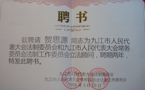 为了建立健全科学立法、民主立法机制,提高立法工作质量和效率,推进立法决策的民主化、科学化。2016年3月10日,九江市人大常委会举行了全市立法工作座谈会,政法学院贺思源博士、汪旭鹏博士被九江市人民代表大会法制委员会和九江市人民代表大会常务委员会法制工作委员会聘为立法顾问。