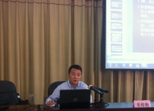 车老师的讲课内容是:民商法理论知识及案例分析、基层法律服务岗前基础知识辅导。讲课过程中,车老师运用自身扎实的法律专业知识和丰富的法律实践经验,通过大量的案例分析并结合最新的《民法总则(草案)》相关内容,较全面的为培训班学员们系统讲解了《民法通则》《婚姻法》《继承法》《知识产权法》《合同法》《物权法》《担保法》《侵权责任法》等对基础法律服务工作者具有极强针对性和实用性的现行民商事法律制度,加深了学员们对相关法律制度的理解,有利于提高他们今后的法律实践工作水平。车老师精心制作了内容丰富、图文并茂的PPT,以案说法、精析法理、语言生动,适时地与学员交流互动,教学效果很好,受到了与会学员及市局领导的高度好评。