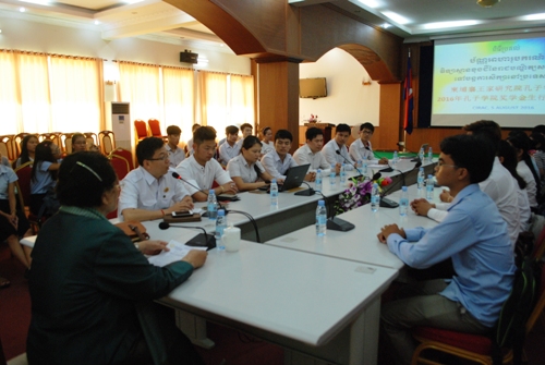 8月5日下午,柬埔寨王家研究院孔子学院在王家研究院礼堂召开2016年孔子学院奖学金生行前会议。柬埔寨王家研究院院长、孔子学院理事长克洛媞达院士(Academician KHLOT Thyda)出席会议,孔子学院院长谢莫尼勒阁下(H.E.CHEA Munyrith)主持会议。