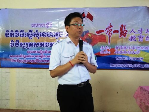 8月13日,柬埔寨王家研究院孔子学院院长谢莫尼勒阁下(H.E. CHEA Munyrith)赶赴磅湛省做“一带一路——人才培养和教育的新丝路”宣讲会,正式启动柬埔寨王家研究院孔子学院磅湛省西部大学(Western University)汉语中心,孔子学院教学点扩展到11省31个。磅湛省西部大学招生办公室主任殷桑波(YIN Sambok)出席宣讲会,200余名磅湛省大、中学生参加了活动。