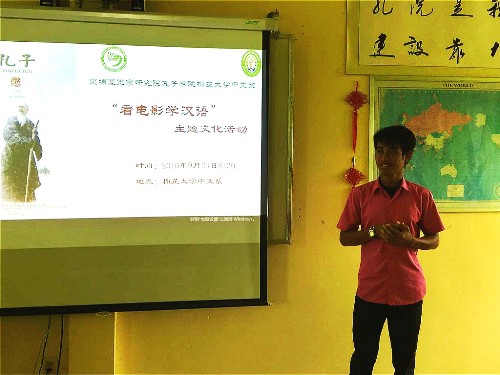 9月24日,“孔子学院日”,柬埔寨王家研究院孔子学院棉芷大学中文系举办“看电影、学汉语”主题文化活动,志愿者教师刘欢和薛佳菁主讲,棉芷大学中文系师生约50人参加了此次活动。