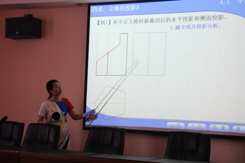江西省第二届高校青年教师教学竞赛由教学设计、课堂教学和教学反思三部分组成。参赛者要完成参赛课程20个学时的教学设计和与之相对应20个教学节段的PPT。周玉华老师此次参赛课程为《机械制图》。本次辅导活动中,她讲解了《平面与平面立体相交》。在她讲解完后,参加活动的人员逐一进行了点评。