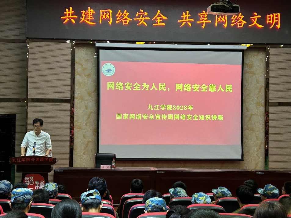 该学院聘任九江市公安局警官为校外辅导员,并定期为同学们开展作网络安全教育宣讲,围绕“网络安全为人民,网络安全靠人民”一系列主题活动,让网络安全知识进教室。让同学们进一步认识到网络安全与个人生活息息相关,坚守法律底线,规范网络行为。开展公益宣传,网络安全进宿舍。学院利用微信、LED电子屏、张贴海报等形式,发挥线上线下多渠道宣传优势,让网络安全知识宣传进宿舍,营造共同构建网络安全防线的浓厚宣传氛围。